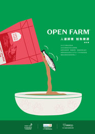主視覺是把草飼羊口味乾糧、鮮熬雞骨湯、鮭魚口味濕糧倒入寵物碗中,該口味的動物也跳進碗中,強調OPEN FARM產品來源是人道飼養的,並建立道德的形象,讓寵物主人買得安心。